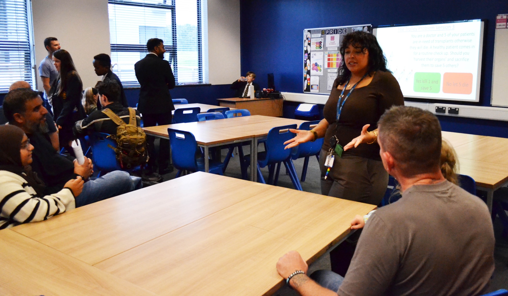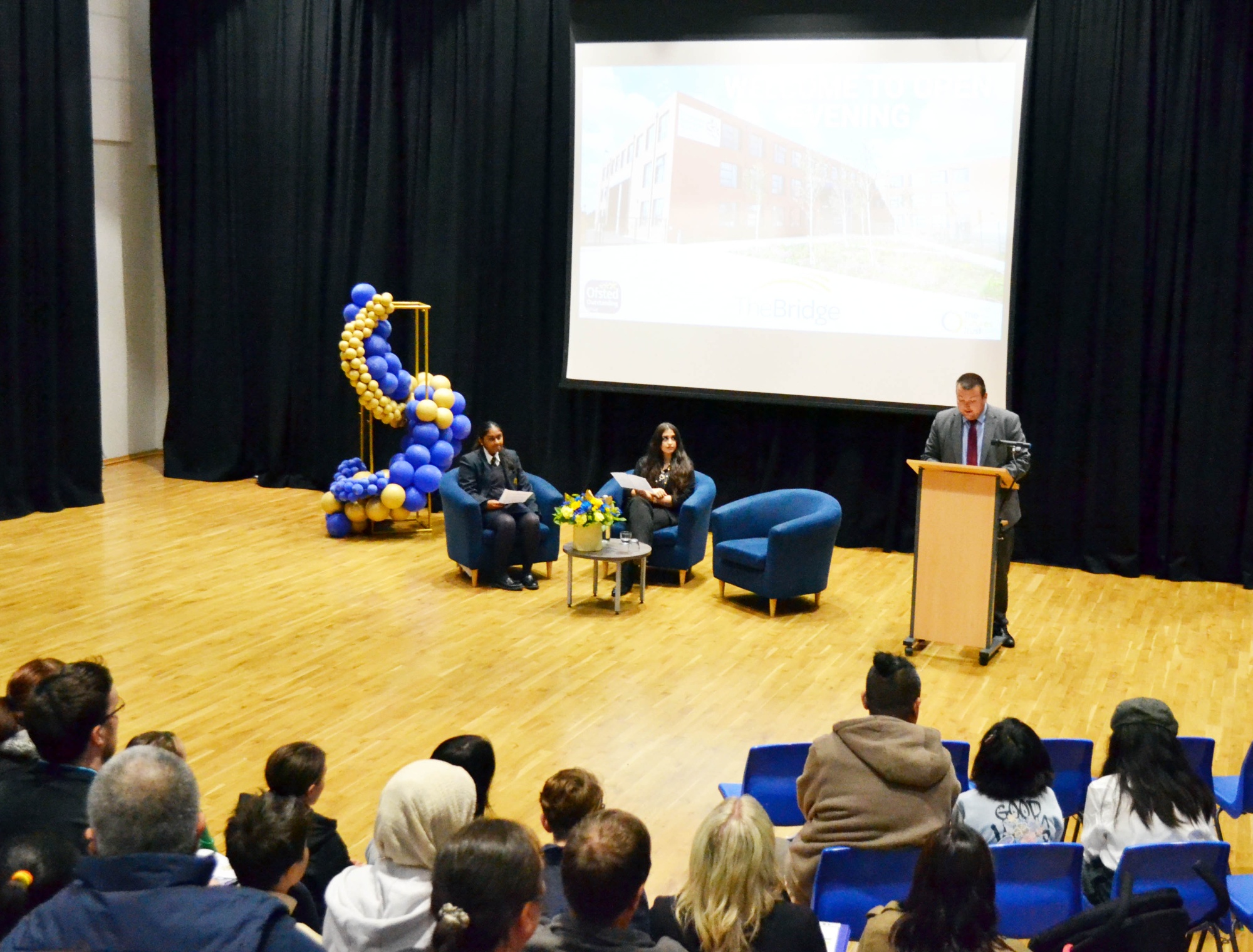 Parent/carers and prospective students listened to Year 8, Year 13 students and the headteacher, Mr Lane, talk about the ethos of the school, expectations from the students and what it's like to be a student here.