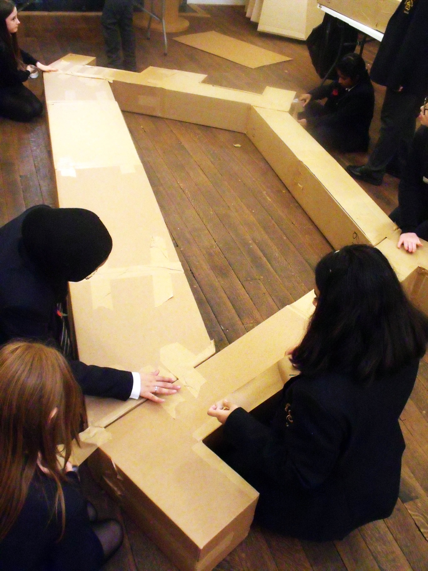 During the Tuesday session, twelve students were given instructions by Olivier Grossetête the artist who showed them how to tape together boxes that would form the roof section of the structure.